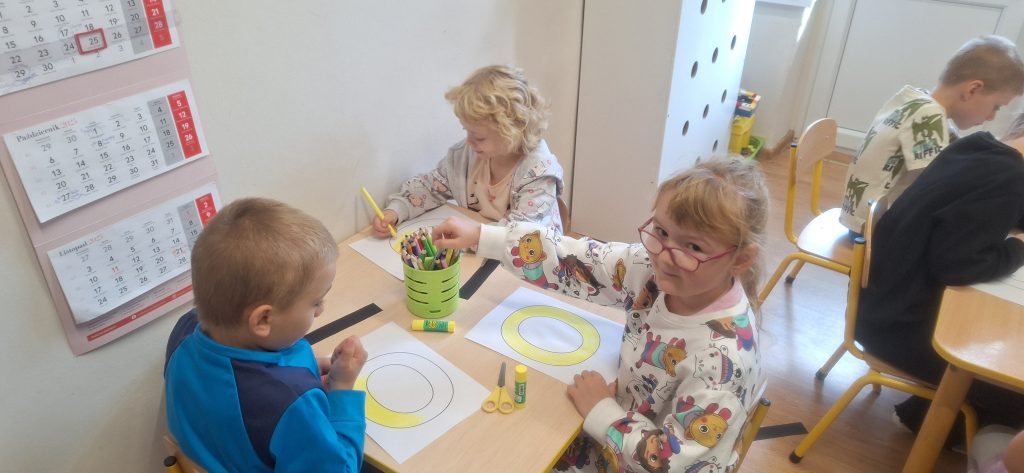 Poznajmey literę "O", na krzesełku, przy stoliku i na dywanie, piszemy, układamy,wyklejamy.