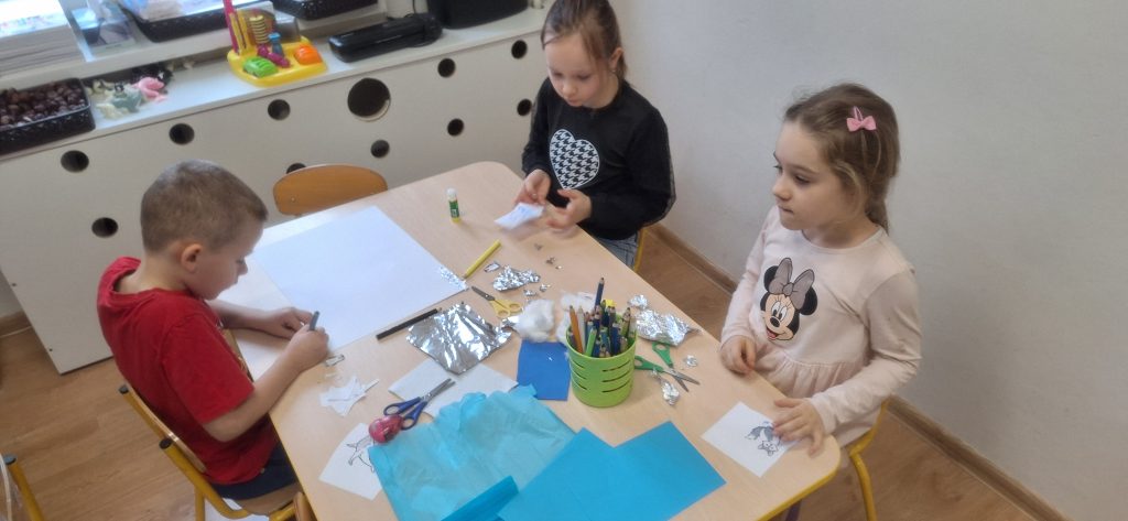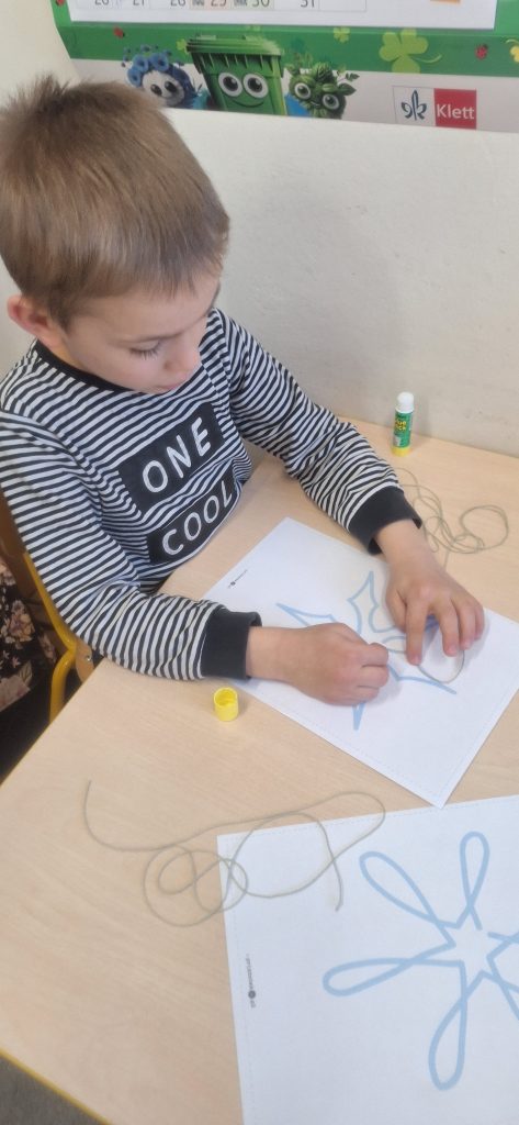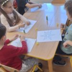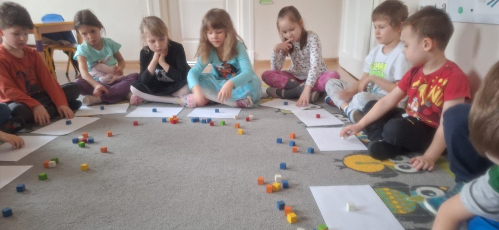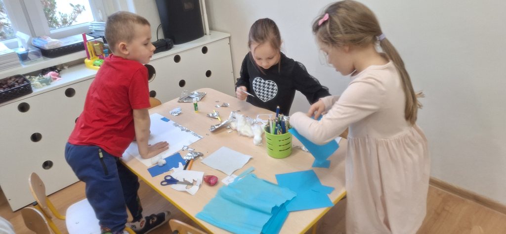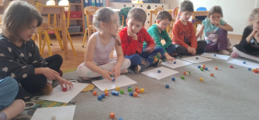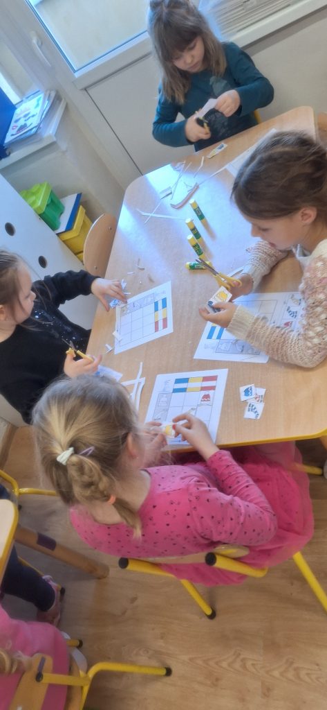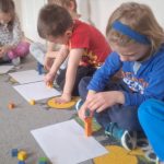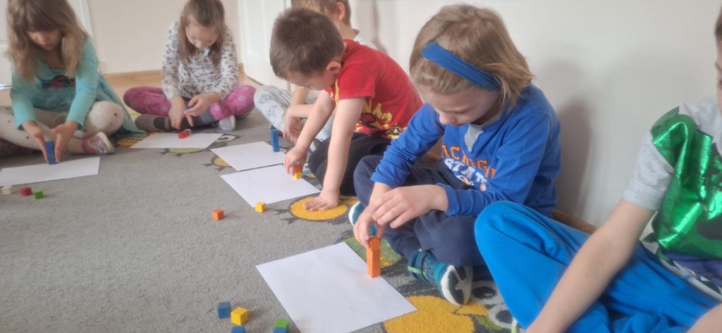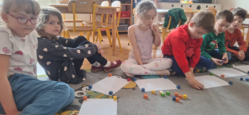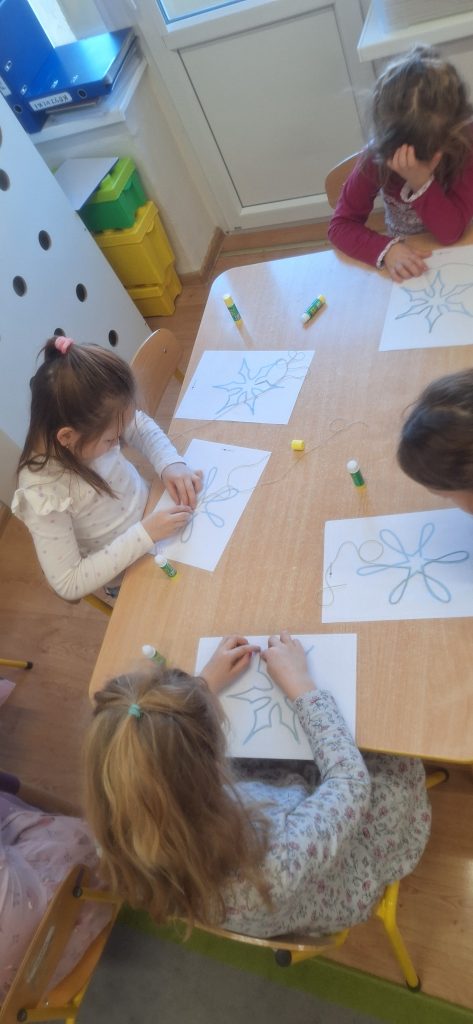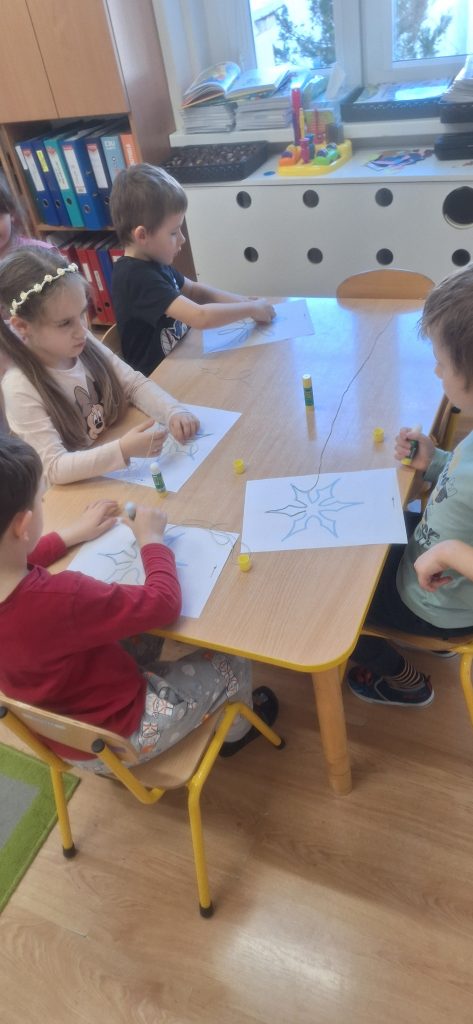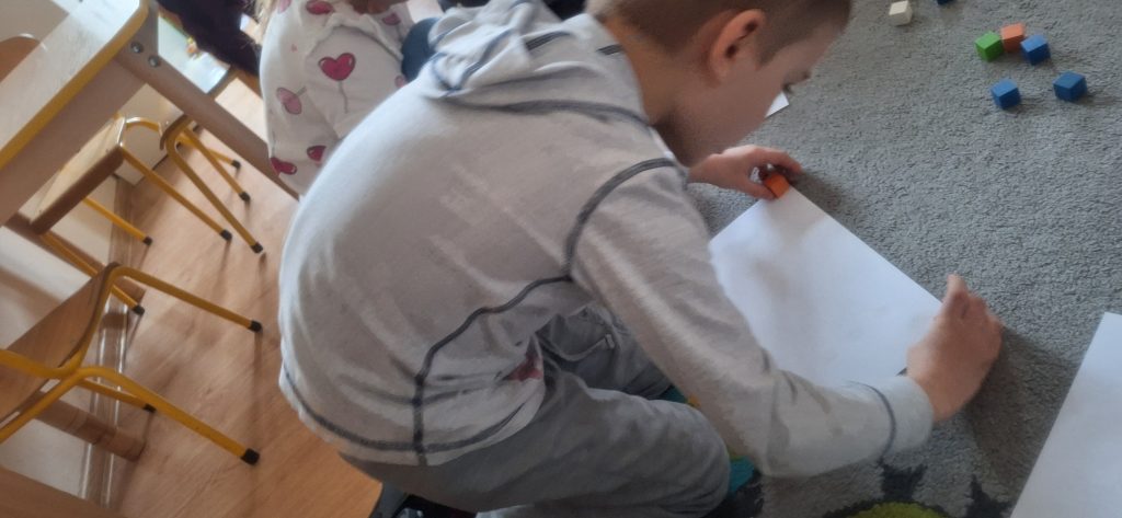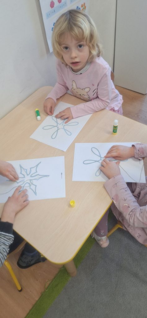 zajęcia styczeń - ćwiczymy koordynację ruchową, wyklejamy śnieżynki, ćwiczymy orientację na kartce papieru z kolorowymi klockami