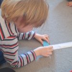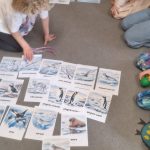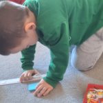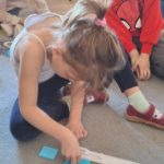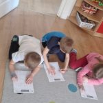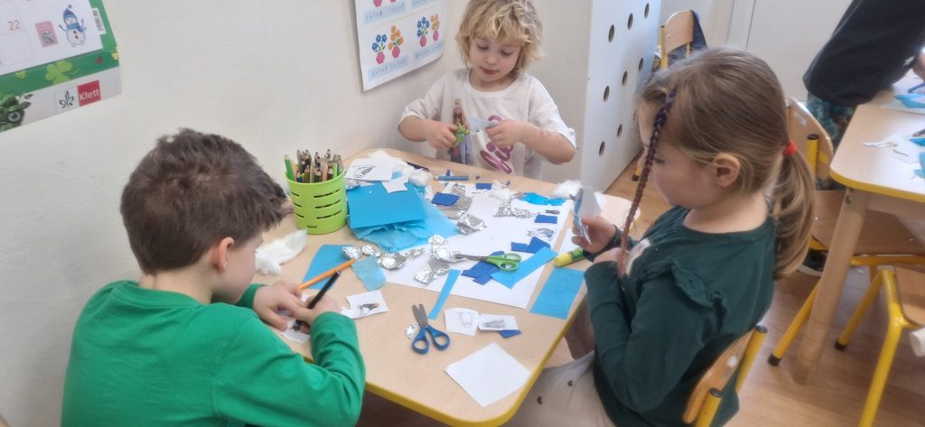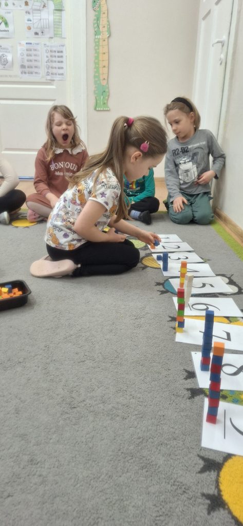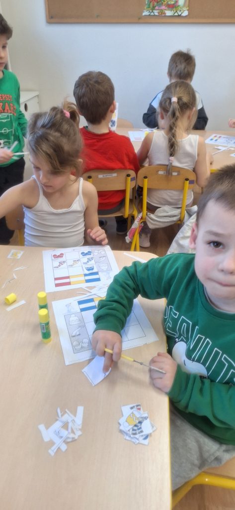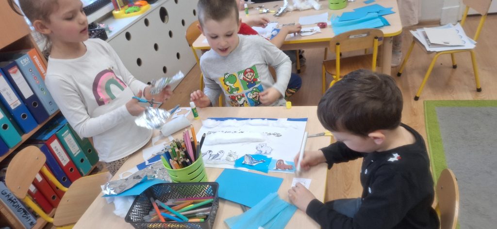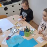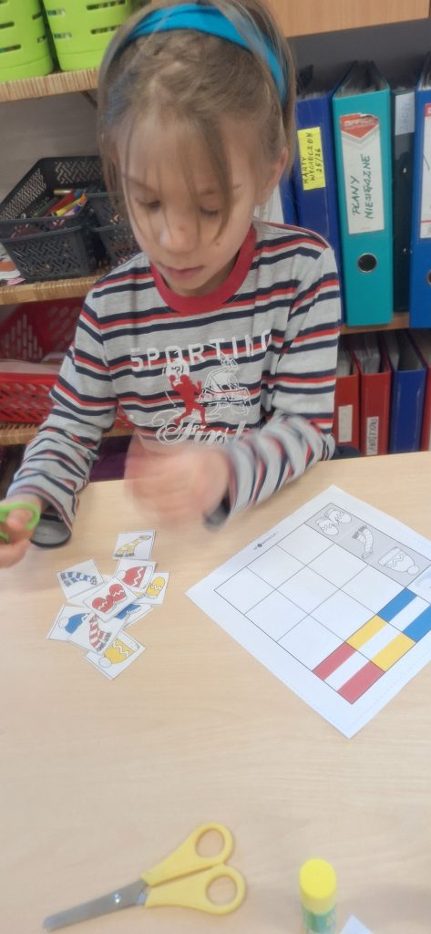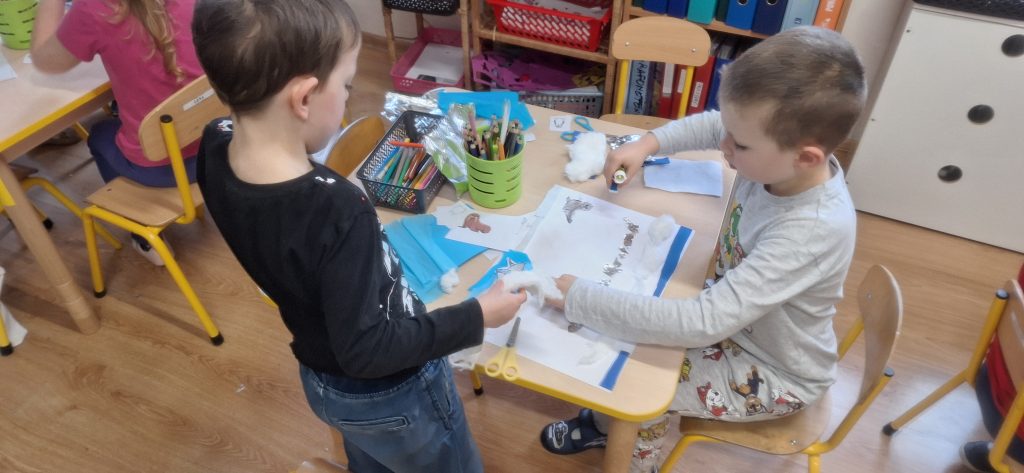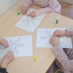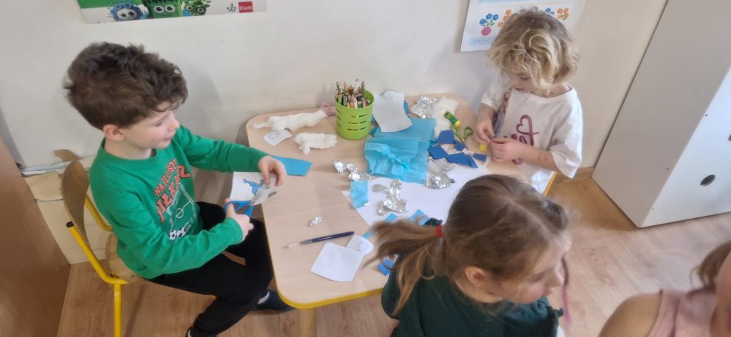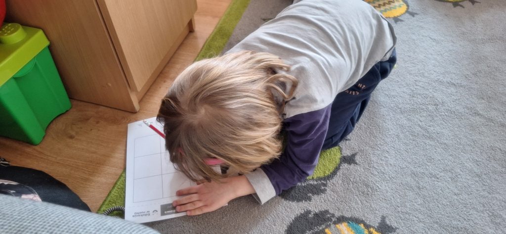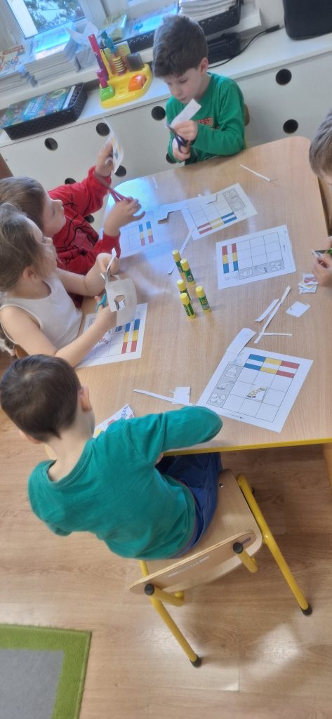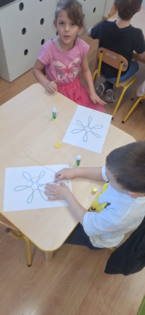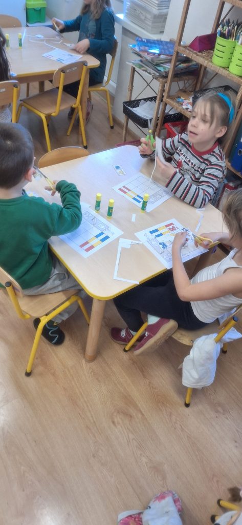 zajęcia styczeń - ćwiczymy koordynację ruchową, wyklejamy śnieżynki, ćwiczymy orientację na kartce papieru z kolorowymi klockami